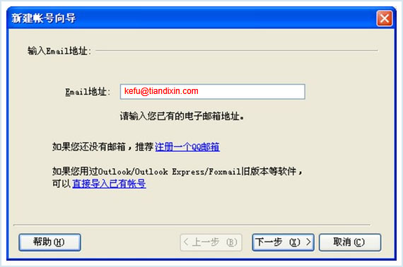 4、填写邮箱帐号:kefu@tiandixin.com(换成您自己完整的邮箱地址)