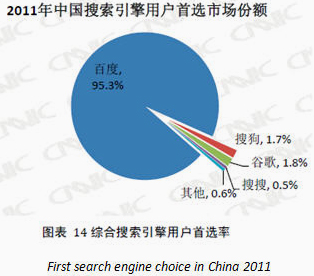 2011百度在国内的搜索引擎中仍处于主导地位。基于2011年10月份的CNNIC数据报告,百度在流量上有83.6%的市场份额,搜搜位居第二,拥有7.3%的市场份额。 2012百度在国内仍会是国内大多数网民的首选搜索引擎,2011年CNNIC统计有95.3%的受访者表示首选百度。81%的受访用户表示他们只使用百度。如下图所示