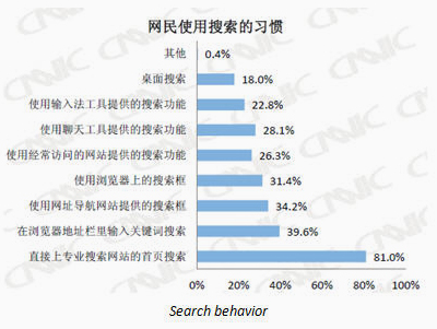 纵观用户的搜索习惯,直接在搜索网站首页搜索的用户仍处于首位,占到了81%。然而,有趣的是有有39.6%的用户选择直接在浏览器的地址栏内直接输入关键词搜索。34.2%的用户选择在网址导航如hao123这类站点内的搜索框中搜索。有31.4%的用户会使用浏览器上附带的工具栏进行搜索。如下图所示。优化的“链带”效应