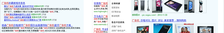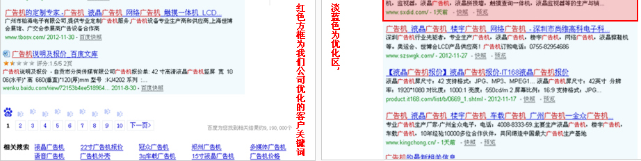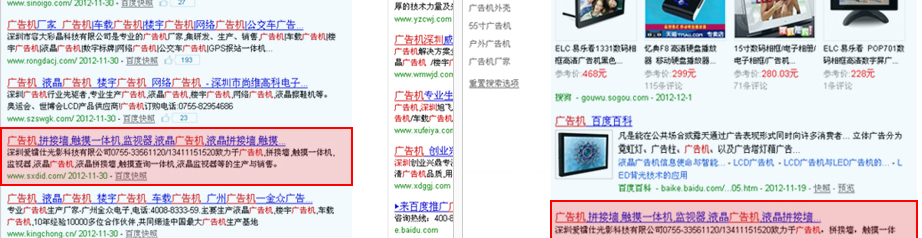 以上以关键词“广告机”为例,红色方框为我司帮客户优化的首页排名位置,百度排名首页第五,搜狗排名第四,此关键词优化只针对百度进行优化,但是却在搜狗里面能排名第四,由此说明,关键词优化具有较强的链带作用,这个是竞价推广排名无法比拟的效果