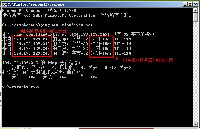 2、弹出cmd.exe程序以后,在黑色编辑器上输入PING+域名,然后回车,通过对该域名PING出来的IP地址,我们可以判断网站域名解析否生效、域名解析是否受到攻击而改变了原有的地址。如下图: